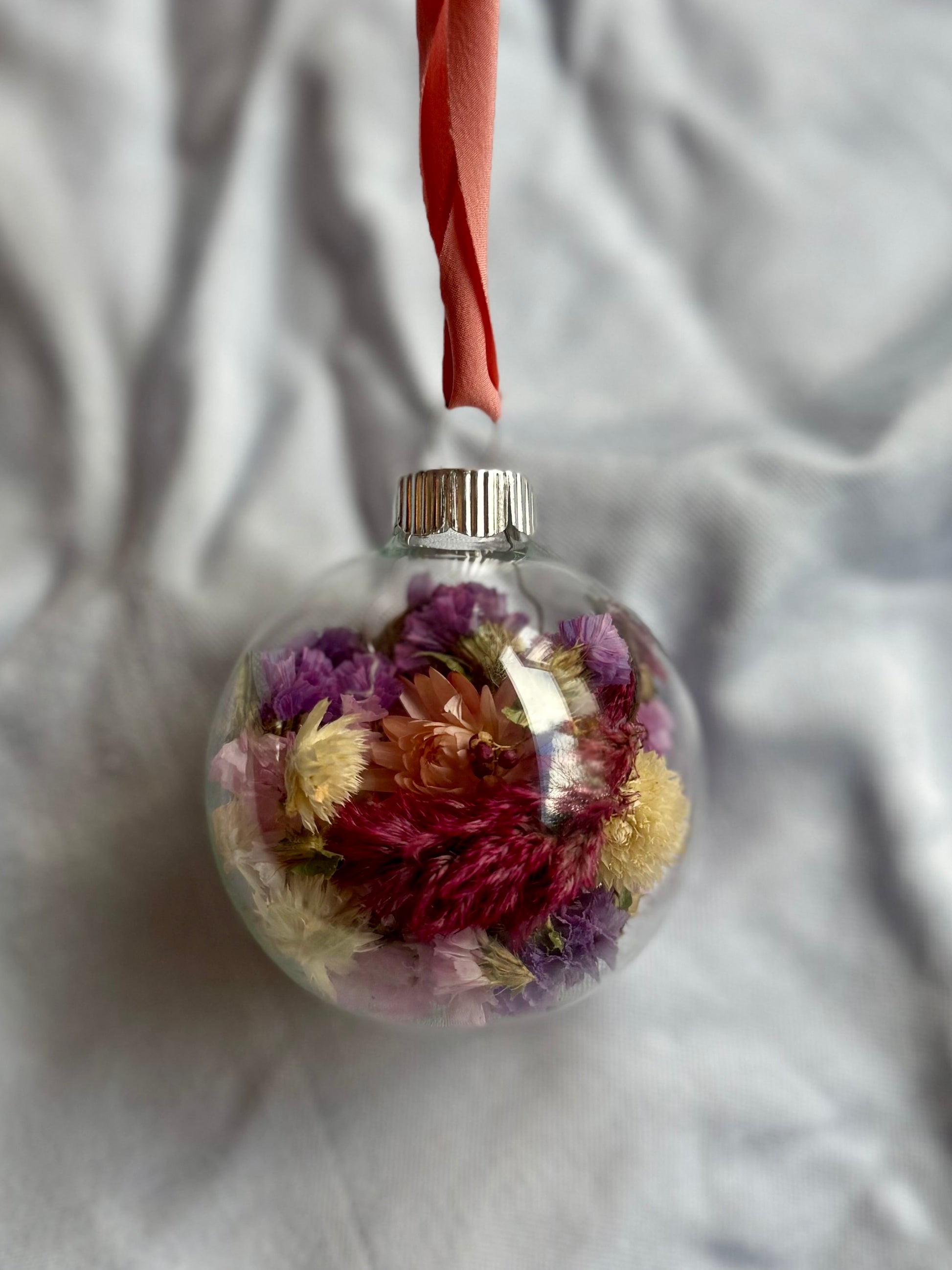 Each Dried Flower Glass Ornament is hand assembled using flowers that have been grown and dried on our farm. Ornaments measure approximately 3 inches in diameter.